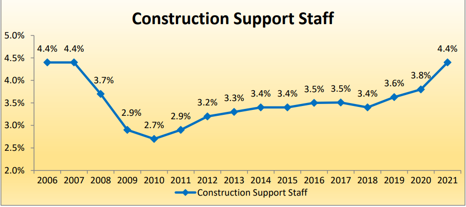 According to the latest Contractor Compensation Quarterly (CCQ) published by PAS, Inc., construction support staff wages are to rise by an average 4.5%. The prediction is based on data gathered from over 209 companies in the 19th edition of PAS’s Construction Support Staff Salary Survey. This is up from the actual increase of 4.4% for 2021. Looking forward, PAS thinks 2023 support staff increases will likely mimic 2022 activity, unless construction conditions change.