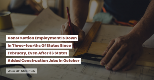 Construction employment in October remained depressed compared to pre-pandemic levels in three-fourths of states despite the fact 36 states and D.C. added new construction jobs in October, according to an analysis by the Associated General Contractors of America of government employment data released today. Association officials added that demand for most types of nonresidential projects remains weak amid pandemic-related uncertainty and urged federal officials to enact a new round of coronavirus recovery measures.