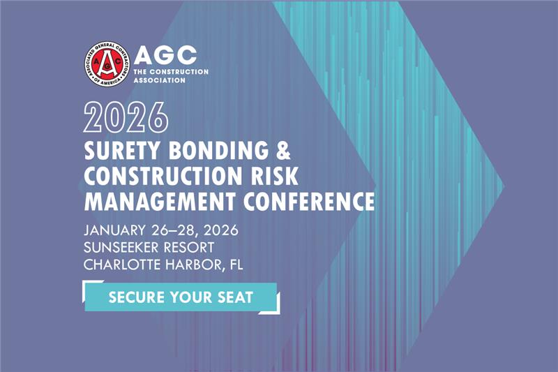 Registration is now open for AGC’s Surety Bonding & Construction Risk Management Conference, January 26–28, 2026, at Sunseeker Resort in Charlotte Harbor, FL. This event sells out every year—secure your spot early to connect with contractors, sureties, insurers, and industry experts shaping the future of construction risk management. Register Now!